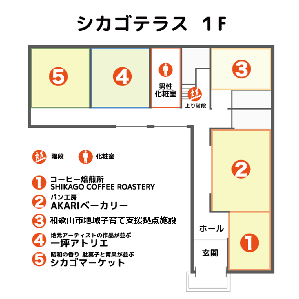 1階には、地域で採れた食材の販売をはじめ、地域の方が主体となって運営していくマーケット、コーヒー焙煎所、パン工房、和歌山市子育て支援事業拠点施設、2階には、保育園の遊戯室を地域のコミュニティースペース、放課後等児童デイサービスがあります。